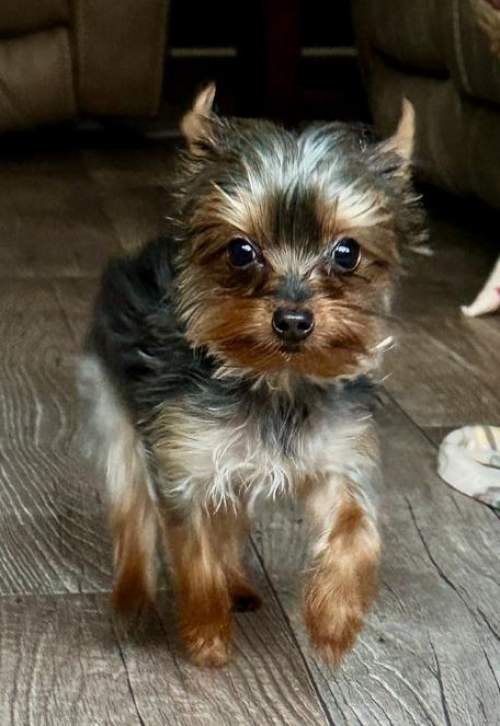 She would do great in a home with other dogs her size, but definitely NO CATS! She is quite the hunter outside chasing birds and squirrels and even stray cats if they happen to get into the yard. She is submissive, but don’t mistake that for a pushover. She is quite the mom when she needs to put another dog in line for something, but she doesn’t start anything. Even though she isn’t your typical looking yorkie, with her longer legs and her full tail, Emma is a very beautiful girl. She has the most angelic face and is just the sweetest baby. She is such a good girl and will use the pee pads when she needs to, but will also do her business on her many trips outside.