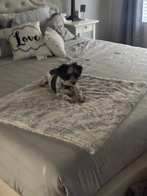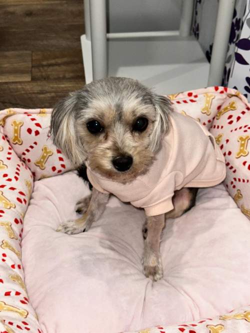 We would do better without any small children around. We are very quick, so around open doors, you have to be very careful so as not to let us out. We can be very fast and are very curious. Although, we do focus on pleasing foster mom and dad. We are very good in the potty department. We will use pee pads and go outside. We aren’t the best when at the groomer, but nevertheless, she can still get the job done and we are good for our weekly bath and blow-dry at home. We eat like champs and are ready to go to bed at whatever time you like. Both of us like to get in the human bed, but when it’s time to go to sleep, my sister will stay in the human bed for a while and then come and joint me on the sofa in the middle of the night. I like more room to myself and the bed has other pups in it.